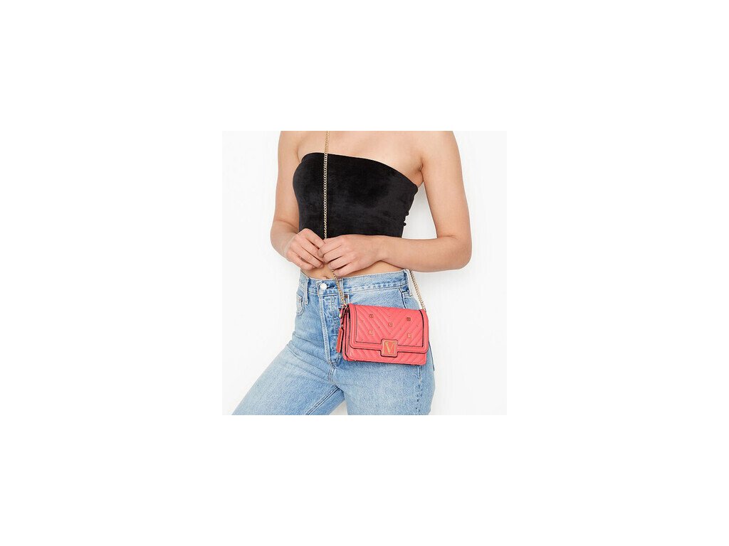 Elegantná crossbody kabelka z. Victoria´s Secret Mini Shoulder bag coral v ružovej farbe so zlatými doplnkami. Retiazka umožňuje kabelku nosiť ako crossbody aj cez rameno, zatváranie na magnet.