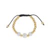 Náramok na šnúrke so zlatými korálkami z chirurgickej ocele v zlatej farbe a guličkami s kryštálikmi čírej farby. Veľkosť náramku je možné nastaviť podľa potreby.