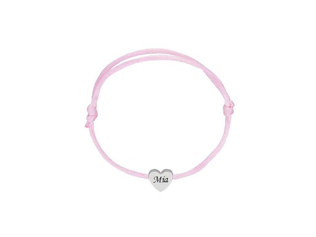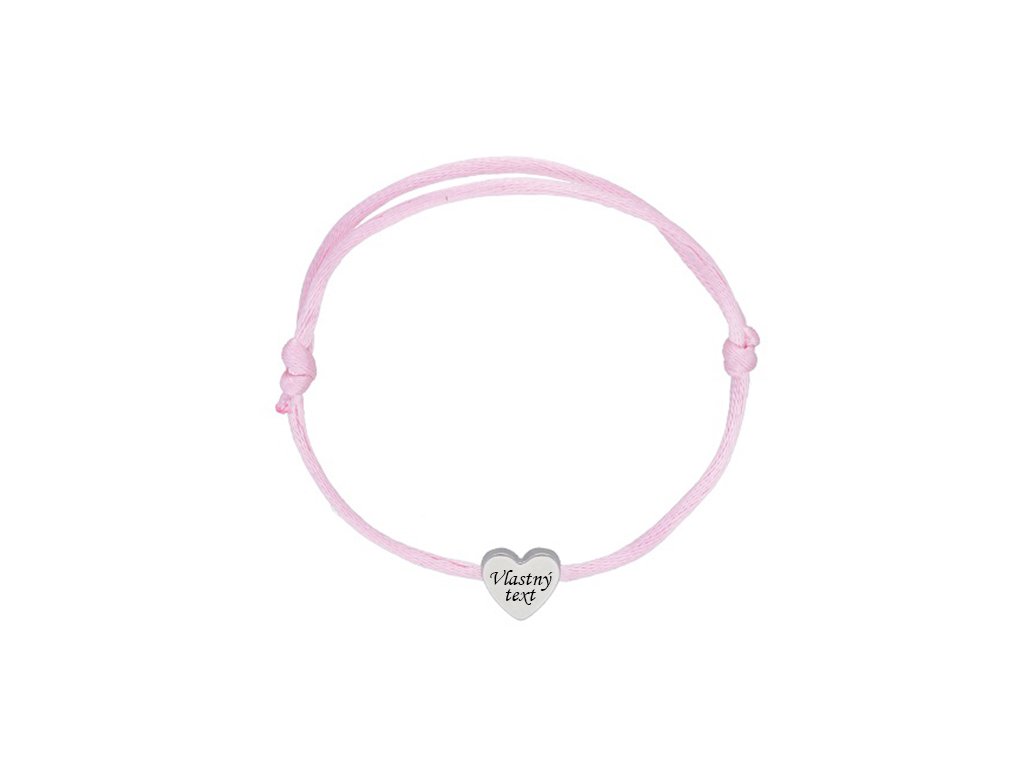 Náramok pre deti. Šnúrkový náramok s gravírovaným textom / menom z ružovej šnúrky so strieborným srdiečkom (11 x 11mm) z chirurgickej ocele (max. dĺžka: 200 mm). Nastaviteľná veľkosť náramku.