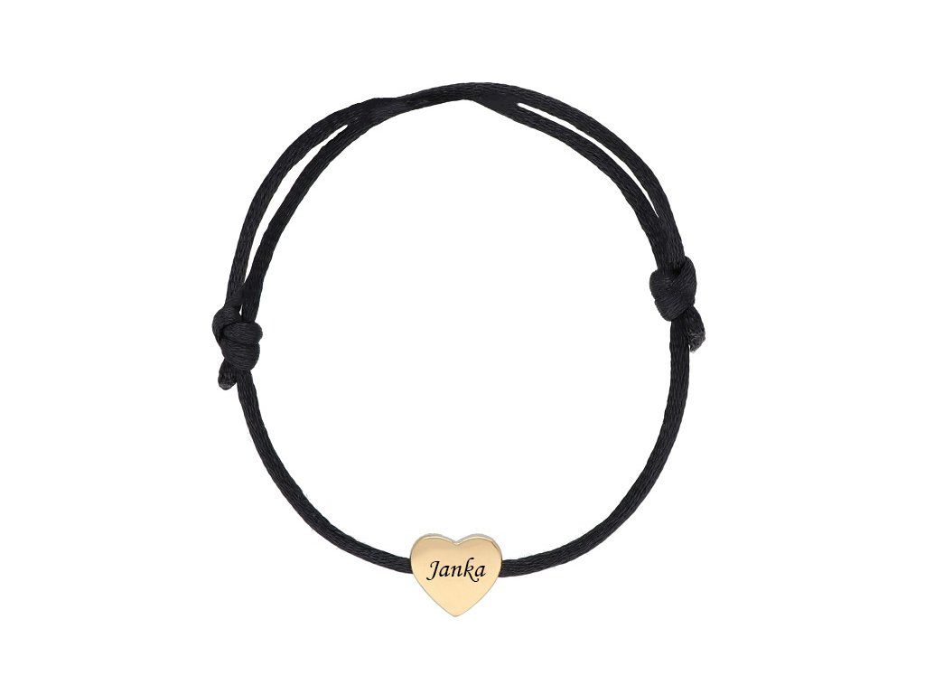 Šnúrkový náramok LOVE s gravírovaným textom / menom z čiernej šnúrky so zlatým srdiečkom (11 x 11mm) z chirurgickej ocele (max. dĺžka: 220mm). Nastaviteľná veľkosť náramku.