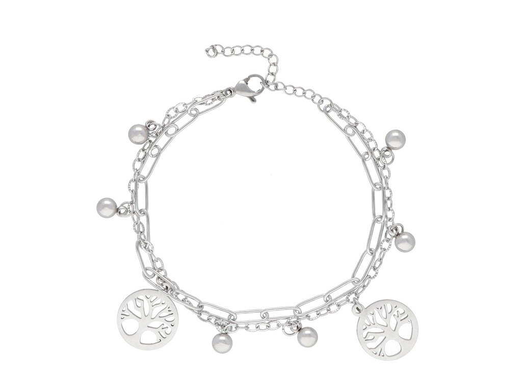 Náramok STROM ŽIVOTA (14 mm) a s príveskami, z chirurgickej ocele v striebornej farbe (dĺžka: 180 + 40 mm).