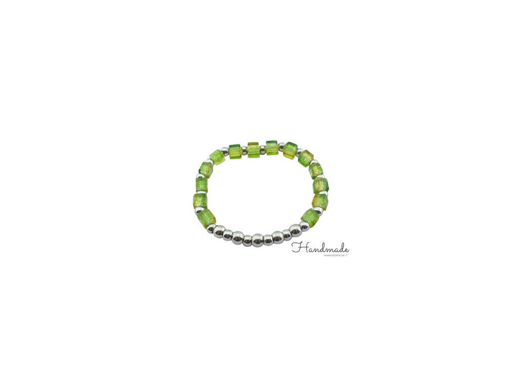Farebná kombinácia: zelená / strieborná. Náramok je navlečený na elastickom vlákne. Náramky vyrábame v univerzálnej veľkosti s dĺžkou 185 mm (vyhovuje na zápästie s obvodom 160 mm).