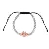 Náramok na šnúrke v striebornej farbe s korunkou vo farbe rose gold z mosadze s detailom so zirkónmi. Veľkosť náramku je možné nastaviť podľa potreby. Nevhodné pre použitie vo vode