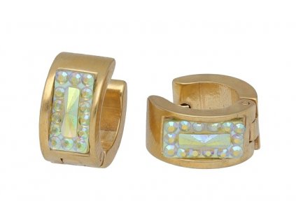 Náušnice z chirurgickej ocele v zlatej farbe, krúžky s kryštálikmi - priemer: 14 mm, šírka: 7 mm