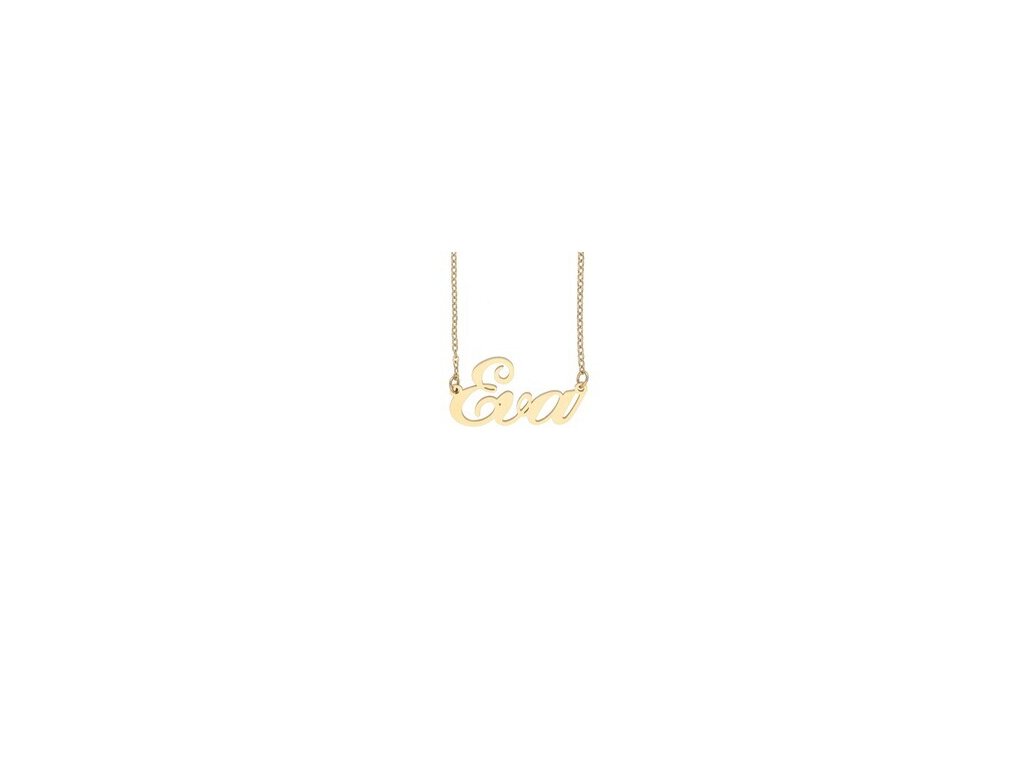 Náhrdelník s menom EVA z chirurgickej ocele v zlatej farbe. Rozmer nápisu: 27x13 mm, dĺžka retiazky: 470 mm.