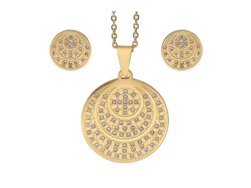 Set šperkov z chirurgickej ocele v zlatej farbe so zirkónmi, prívesok medajon - priemer: 30 mm, retiazka - dĺžka: 450 mm, náušnice napichovacie - priemer: 14 mm