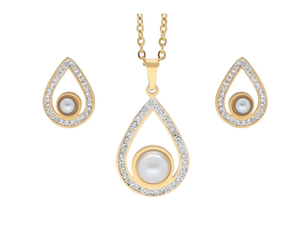Set šperkov z chirurgickej ocele v zlatej farbe s kryštálikmi a perličkami, prívesok - rozmer: 32x17 mm, retiazka - dĺžka: 460 mm, náušnice napichovacie - rozmer: 16x12 mm
